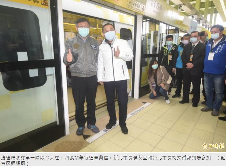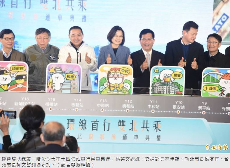 捷運環狀線第一階段今天在十四張站舉行通車典禮,蔡英文總統、交通部長林佳龍、新北市長侯友宜、台北市長柯文哲到場參加,隨後侯、柯在雙北捷運局長帶領下聽取簡報並搭乘列車至新北產業園區。環狀線第一階段也預計在下午2點起營運,未來提供一個月免費搭乘,3/1正式收費,快速縮短新北部分地區乘車時間及距離。