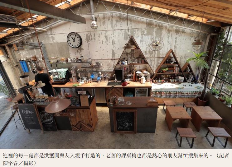 他說:「剛開始這裡真的什麼都沒有,只有一堆垃圾、雜草叢生,但是租金便宜,又不想花大錢翻新裝潢,所以我決定自己來!」洪璽開悠悠地指著四周,細數著自己是如何打造鐵皮屋頂、木製吧台、修補破牆等,被問到「這些你原本就會做嗎?」他笑說:「完全不會!就是自己摸索、請教相關人士慢慢學會。」當時情義相挺的朋友更為此不慎受了點傷,送醫包紮後隔天仍上門幫忙。洪璽開憑著一股傻勁與好友們花了半年,將廢棄倉庫修補成烘豆所,之後小破爛咖啡館因房租調漲而歇業,小廢墟進而轉型為咖啡館,洪璽開說:「待在這很有安全感,像是被包覆著,有一種全世界都找不到我的感覺。」