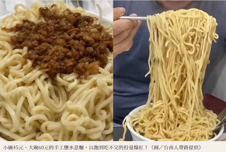 台南小吃屢屢成為吃貨們的討論話題,這回隱藏在安平的「手工鹽水意麵」,靠著超狂大份量爆紅,乾麵有麻醬、肉燥、沙茶3種醬可任選,Q彈麵條配上樸實口味,價格相當親民,尤其在拌麵的時候,麵多到可以在分裝一碗,Youtube頻道台南人帶路就在影片實際試吃,大推:「大碗公意麵,一碗60塊多到跟山一樣」,都忍不住笑說「已經吃了20分鐘,麵還是這麼多,就像是一直會長出來的聚寶盆麵」,大力稱讚是台南人的福音,並建議大家在品嚐的時候可以添加醋、醬油或辣椒添味。
