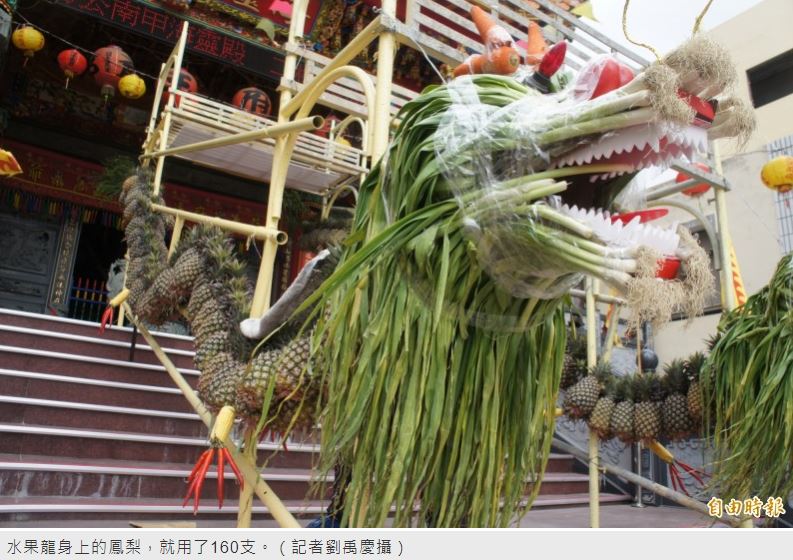 今年馬公南甲海靈殿,以8米長鋼筋為主幹,使用160顆鳳梨當作龍身,龍頭用20斤香蕉為主幹,再搭配70斤的大蒜當龍鬚裝飾,龍角則使用紅蘿蔔,而龍腳則用玉米製作,以紅辣椒當龍爪,最特別的是龍尾,揚棄原本常用的甘蔗葉,主要是容易枯黃不易保存,製作團隊靈機一動,使用澎湖常見的南洋杉枝葉,更為維妙維肖。