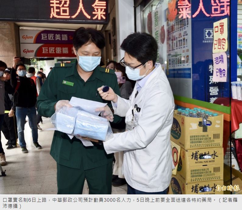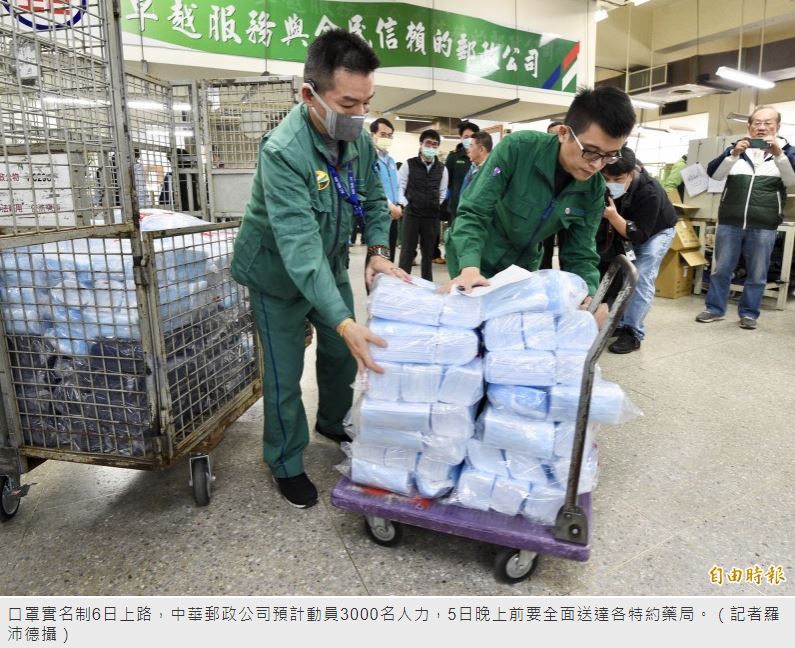 中華郵政公司郵務處長陳敬祥表示,依照衛福部所提供的名單,配送給全台6515處健保合作藥局、52處偏鄉衛生所,每處配給大人口罩200片、兒童口罩50片;每日全台約需配送160萬片,且週一至週日皆會配送,只要藥局有開門,就能拿到口罩賣給民眾。民眾買口罩明日起可赴健保特約藥局限量購買,這些口罩的運送任務將由中華郵政負責。