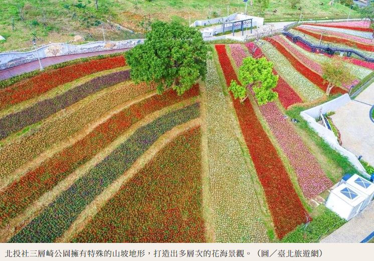 不讓櫻花專美於前,以日本北海道富良野視覺感打造的「北投社三層崎花海」,特殊山坡地形結合2千500平方公尺多層次繽紛花毯,自過年春節開放以來人氣暴漲,遊客不僅搭公車捷運就能一覽美景,還能騎乘YouBike順遊北投知名景點和美食,花期至2月底,是一日遊的絕佳去處。