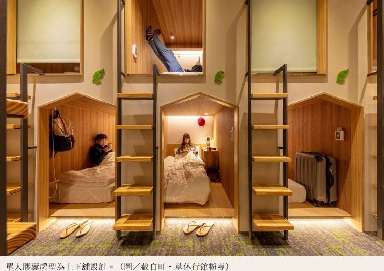 這裡的膠囊單人房型與浴室廁所皆是男女分開,床位分成上下舖的單人床,以及空間更寬敞附有長型木櫃的雙人床位,旅館貼心提供沐浴乳、洗髮精還有dyson吹風機,其餘的毛巾、充電線、行李鎖、茶枕等用品則是採租用方式。