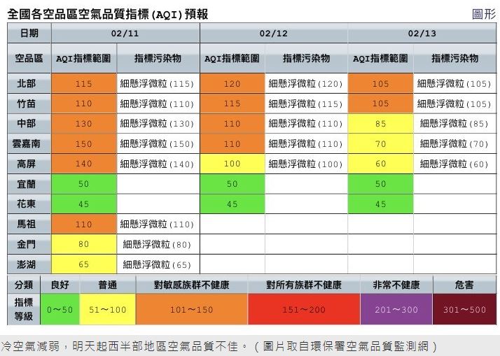 週一起冷氣團減弱,中南部地區空氣擴散條件轉差,污染物易累積,空氣品質多為橘色提醒等級,其他多為普通等級。環保署指出,週二至週四竹苗到雲嘉南地區空氣品質多為橘色提醒,局部短時間達紅色警示等級,請民眾多留意空氣品質變化。