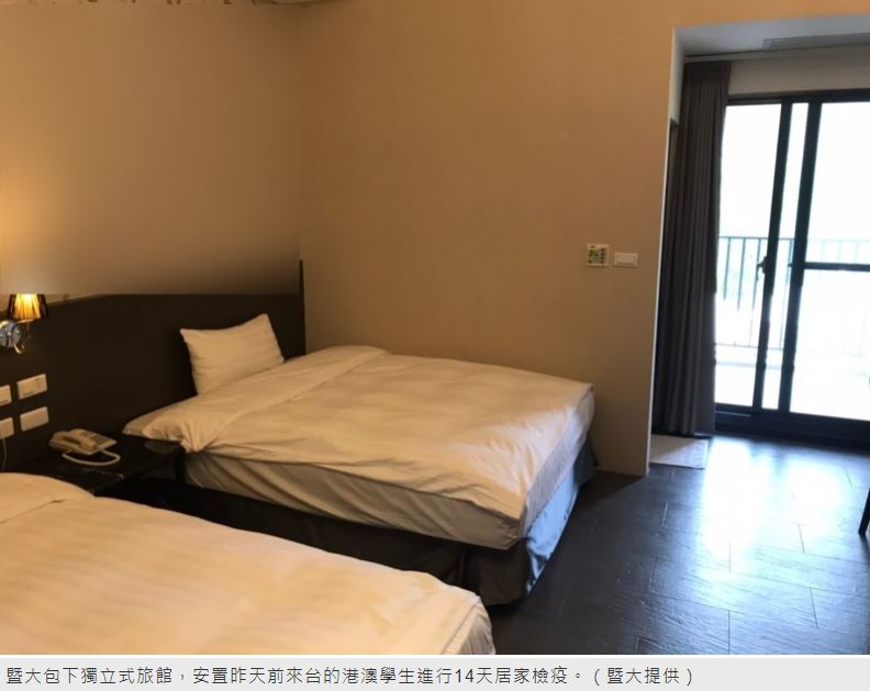 政府宣布今天起港澳學生暫緩來台,該校有25名港澳生昨天深夜搭機抵台,校方漏夜將他們接到獨立式旅館安置,總計旅館內的港澳生有39人,每人單獨1個房間,每天早晚量測體溫,趕在暫緩入台措施回台的學生若無狀況,剛好能趕上25日學校開學,由旅館協助送餐,校方提供口罩、酒精等防疫用品,至於埔里鎮上也有40餘位港澳生,由房東協助居家檢疫,校方每天也與房東保持密切聯繫,有狀況立即協助處理。