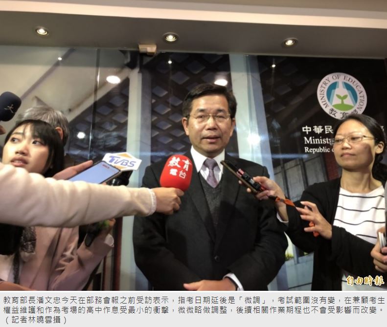 教育部長潘文忠今天在部務會報之前受訪表示,指考日期延後是「微調」,考試範圍沒有變,在兼顧考生權益維護和作為考場的高中作息受最小的衝擊,微微略做調整,後續相關作業期程也不會受影響而改變。疫情指揮中心於2月2日宣布中小學延後開學,同時宣布國中會考、技專統一入學測驗、大學指考等考試日程不變,但大考中心今天開會決議大學指考的考試日程將延後辦理,從7月1、2、3日,延為3、4、5日。