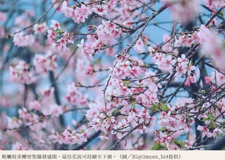 宜蘭冬山「安農溪分洪堰風景區」附近的櫻花林與眾不同,園主引進日本特有品種枝垂櫻,花語為「勿忘我」,上千棵成排自然垂落的櫻花,營造柔美櫻花隧道氛圍也顯得平易近人,淡粉色與獨有的生長方式,穿梭其中無論高低角度,都能捕捉到媲美日本賞櫻勝地的絕美照片,最佳花況預計能持續至下週。