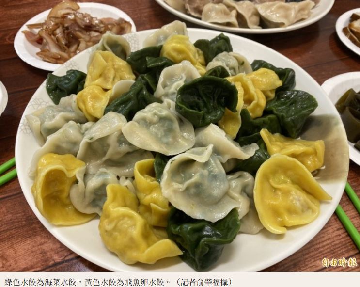黃色水餃是飛魚卵水餃,黃色水餃皮由胡蘿蔔製成,一口咬下的水餃,內餡中除了有豬肉外,還會吃到嗶嗶啵啵的飛魚卵,有小朋友吃到飛魚卵水餃,驚訝的跟媽媽說「好好玩,好像有東西在我嘴巴裡跳舞,還要在吃一個」,讓媽媽大感驚豔。
