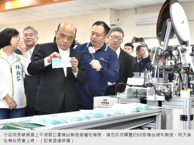 行政院長蘇貞昌上午視察口罩機台製造廠權和機械,蘇貞昌說,在政府與民間協力之下,原需要半年時間才能交機,大幅縮短至1個月內,讓我國口罩1日產能達到千萬片,躍升成口罩第2大生產國。確定政府購置的60部機台順利製造,明天首批機台將會上線。