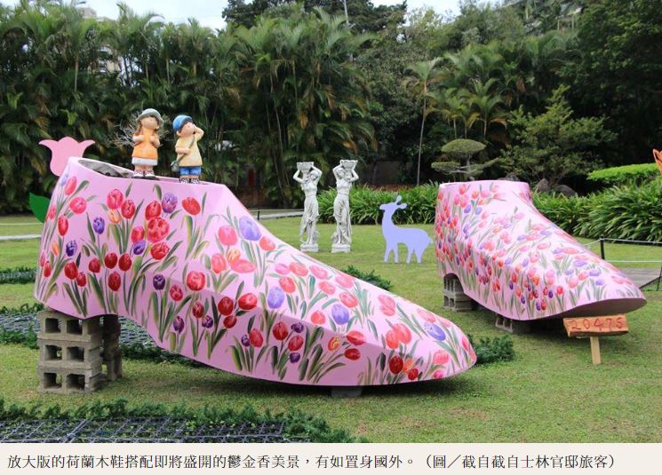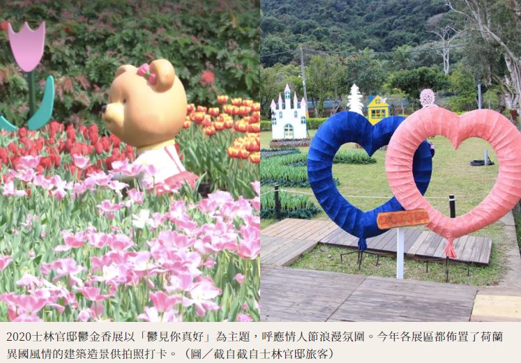 每到春暖花開的時節,士林官邸已成為民眾賞花必遊景點,今年展期自2月14日至2月23日,除了引進日本、荷蘭花卉,更有近20種不同花色、多達10萬株鬱金香及風信子,各式各樣花型多變的鬱金香,包含單花瓣杯狀花型、花瓣像鋸齒波浪般蕾絲的羽狀花型、似玫瑰的多重花瓣型等,令人目不暇給。