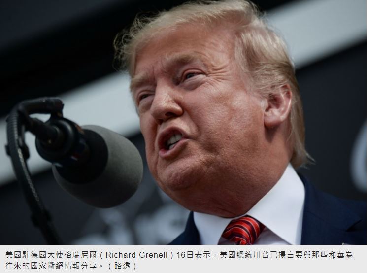 美國駐德國大使格瑞尼爾(Richard Grenell)16日表示,美國總統川普已揚言要與那些和華為往來的國家斷絕情報分享。美國持續施壓盟國,要求各國禁止讓中國電信巨擘華為參與5G網路建設,警告華為會對國家安全構成風險。