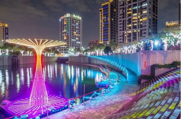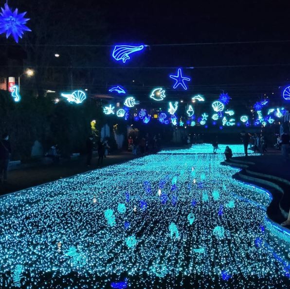 這次新北市水利局推出情人節限定的「幸福下一站,藍調中港」,從中港大排自立廣場開始延伸至周邊再到願景館,夜晚時宛如一座夢幻的大型海底世界,讓人如癡如醉的,沿途都掛上璀璨的藍色LED燈飾,共長達2.3公里的河廊。