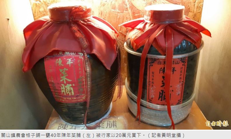關山鎮農會米國學校格子鋪陳列一甕40年的陳年老菜脯,最近被人以20萬高價買走。米國學校校長彭衍芳說,這是鎮店之寶,原不想賣,但客人錢已匯來,正傷腦筋如何寄送。