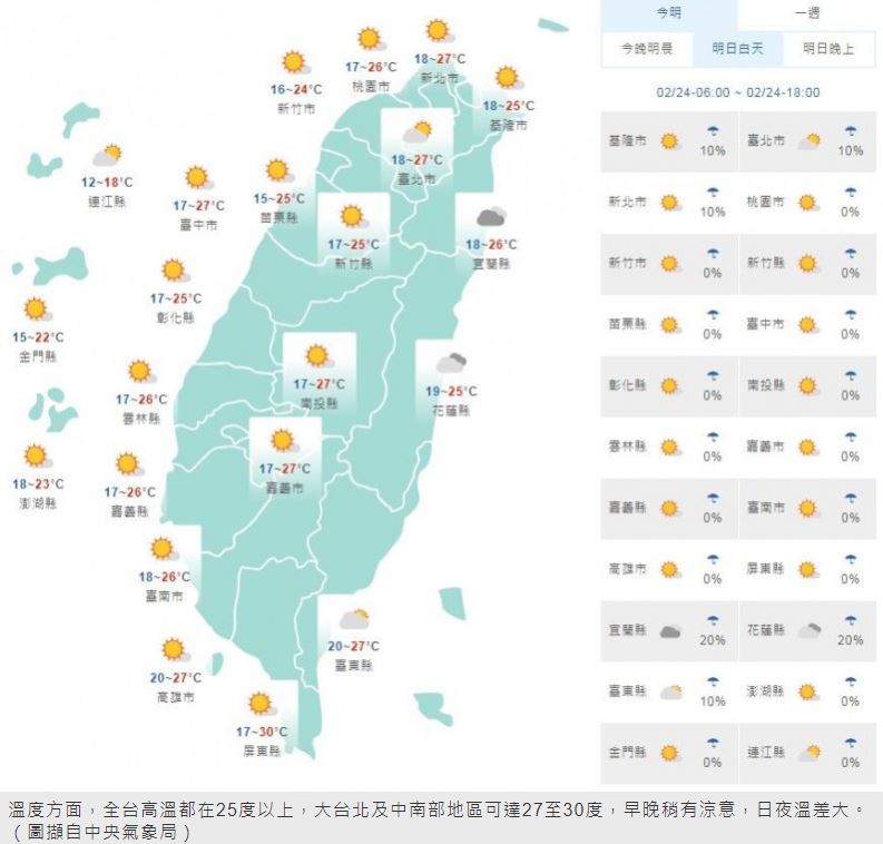 明(24)日由於台灣附近風場轉為東南風,明日各地大多為多雲到晴的天氣,僅東半部地區有局部短暫雨,各地高溫都在25度以上,不過因西半部位於背風側,擴散條件不佳,明日西半部空品不佳。