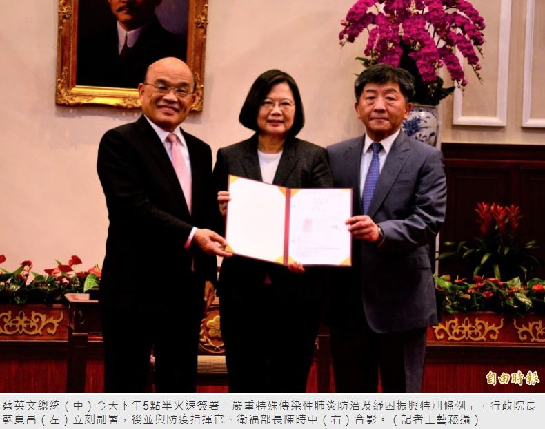 蔡總統說,謝謝朝野政黨合作通過特別條例並展現台灣民主的效率,讓防疫與紓困工作在更周全法律基礎上穩健進行,由於疫情在亞洲與歐洲快速蔓延,在此關鍵時刻,她謝謝蘇貞昌領導行政團隊迅速檢討法規提出特別條例,這也是游錫堃領導的新一屆立法院通過的第一個法案,未來無論防疫物資、隔離措施、乃至散播不實訊息等,都有清楚規定,同時也提供防疫補助以及租稅鼓勵,針對受到疫情衝擊產業,也會提供必要協助。