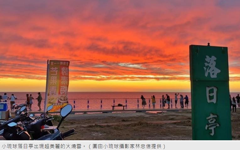 拍攝到美景的小琉球攝影家林忠信表示,出現超美火燒雲及雙彩虹的時間大約在昨天傍晚6點2分,時間大約只有7分鐘,整個天空變成火紅般的雲霞,落日印照在海面上,讓人驚呼不斷,許多在場的遊客都驚呼連連,指出天空全是紅色,雲層一層層不斷的變化和流動,加上落日和海面的跳動及大海的聲音,而西方有落日火燒雲,東方則同時出現雙彩虹,這種奇景近20年來罕見,他於是在小琉球的落日亭拍攝了影片及照片,景氣超級漂亮,美到爆了,太難得一見了。