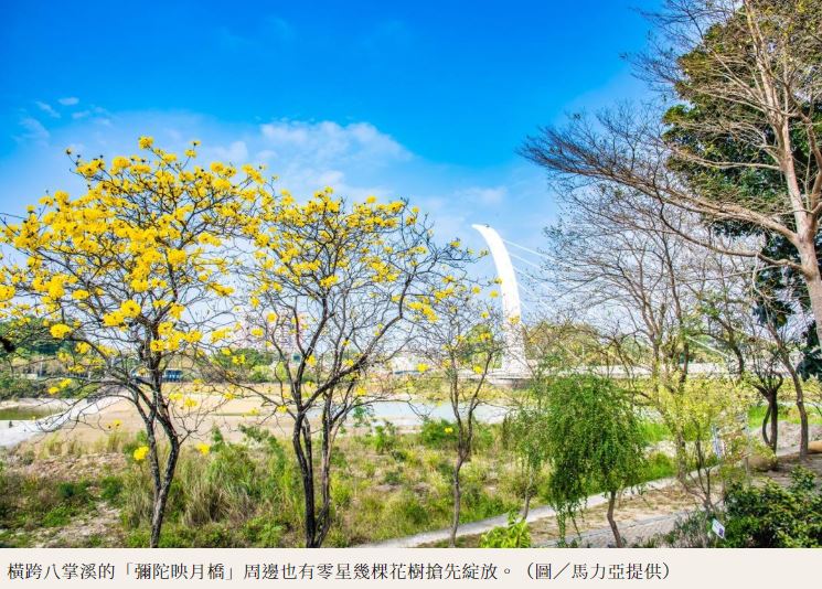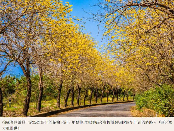 以往在3月初才會相繼綻放的黃花風鈴木,今年嘉義地區搶先捎來第一波開花情報,尤其在嘉義市忠義橋至軍輝橋八掌溪畔,綿延一公里多的金色大道花況極佳,在地網友也PO出中埔鄉一帶的賞景美照,紛紛直呼:今年的花應該會大爆發!
