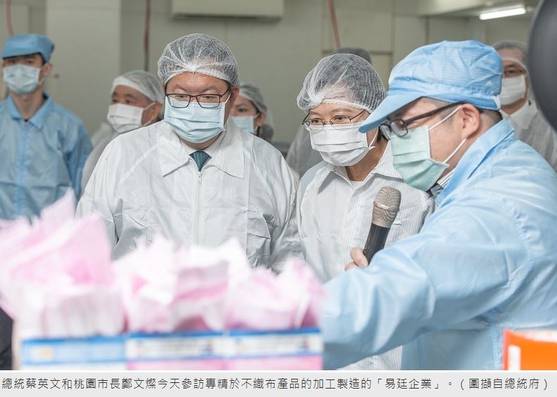 蔡英文提到,她和桃園市長鄭文燦今天參訪專精於不織布產品的加工製造的「易廷企業」,便利商店拿到的網狀便當提袋就是他們的產品,而這次防疫中,業者最短時間內就把分配到的新產線開出最高產能,「這就是台灣的中小企業,世界級的實力」。