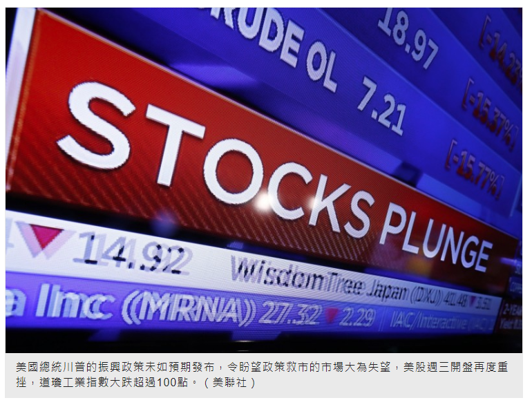 雖然川普宣布將薪資所得稅降至0%,美股週二受此激勵大漲千點,但卻傳出相關經濟振興政策未獲得同黨議員支持,川普不僅未現身記者會,具體細節也將延後發布,令市場大失所望。