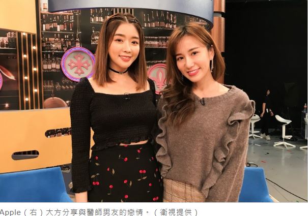 Apple日前被媒體直擊與一名「最帥牙醫」熱戀中,她日前在衛視《一袋女王》大方分享與男友趙醫師交往3個月至今的愛情故事。她單身一陣子後,好友夏和熙某次突然在聚會後,想替她介紹對象,Appe當天因為素顏又穿著邋遢,擔心嚇跑對方,但夏和熙說:「要是看到妳真面目還喜歡妳的話,那才是真愛。」讓Apple無從拒絕。Apple透露趙醫師年紀比她小,而她以往的男友也都是「年下」,但姐弟戀始終沒有好的結果,讓她原本打定主意,不再找比自己年紀小的人交往。