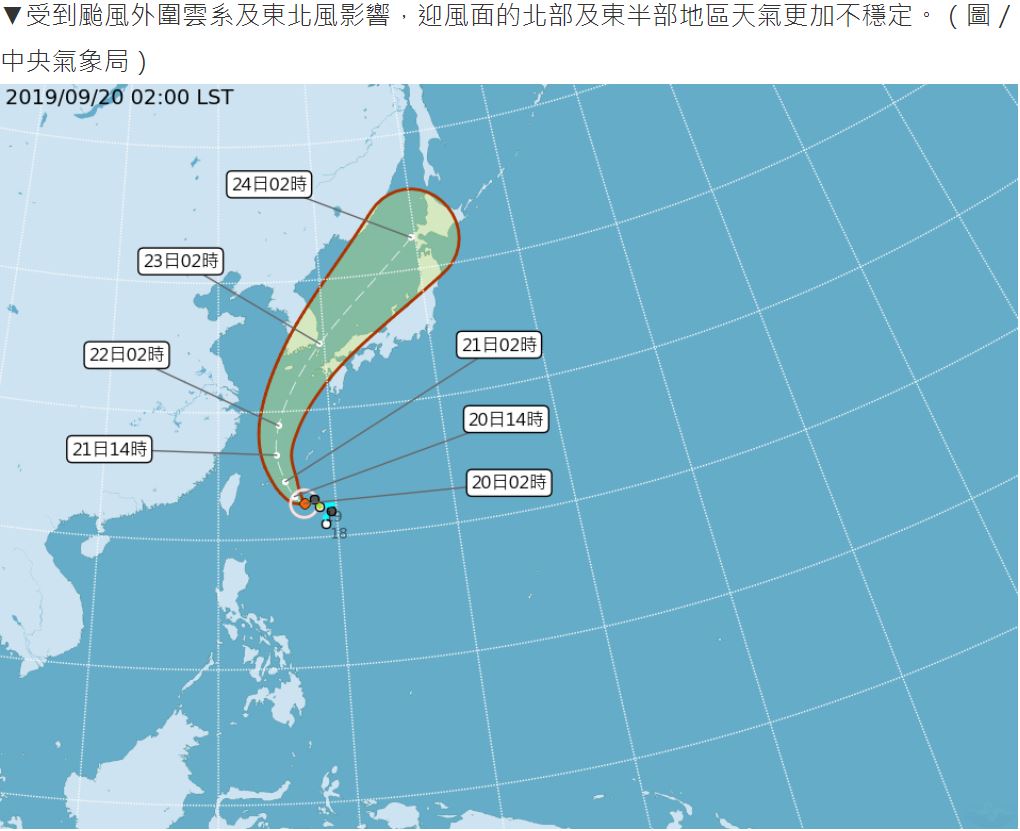 此外,由於東北風偏強,台灣各地沿海地區及澎湖、金門、馬祖、綠島、蘭嶼易有8至10級強陣風,新竹至台南地區亦有較強陣風;沿海及鄰近海域並有較大風浪,提醒民眾海邊及戶外活動請注意安全。而颱風外圍環流影響只到21日晚上,隨後由東北風接力影響北台灣天氣,迎風面北部、東北部有雨,將持續到9月底。