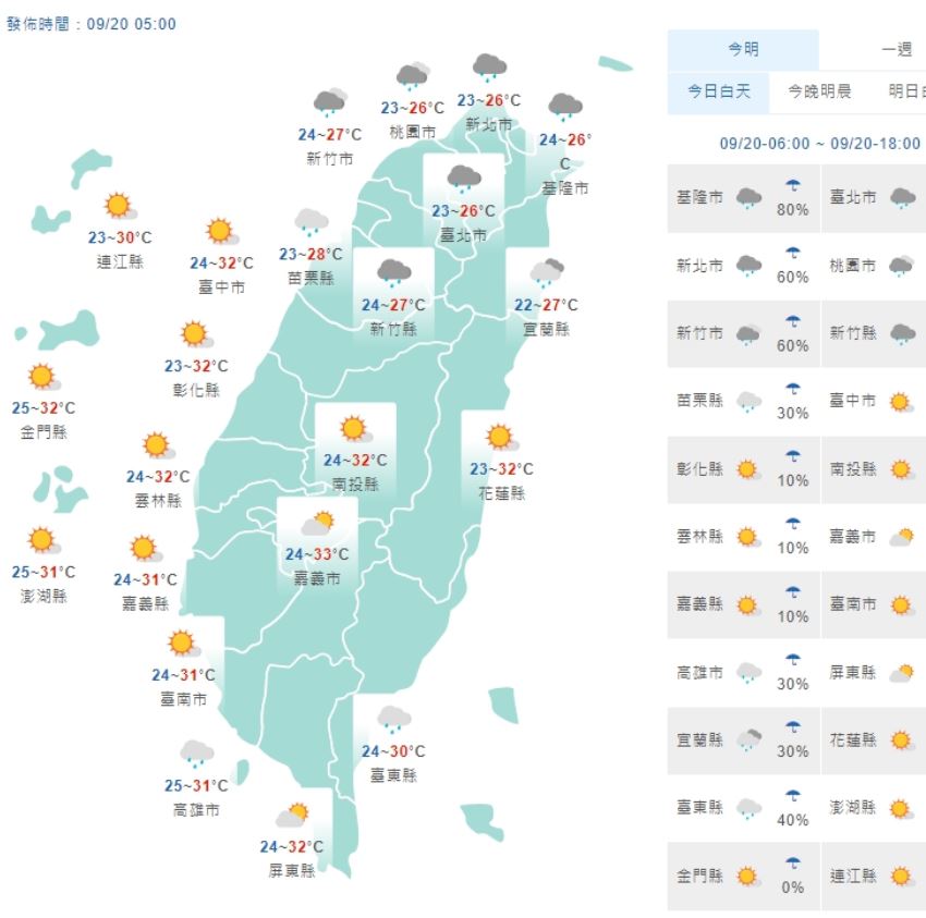 根據中央氣象局表示,今日(20日)受到颱風外圍雲系及東北風影響,增強的東北風使得迎風面的北部及東半部地區天氣更加不穩定,特別是北部及東北部地區,在周五晚間至周六清晨是雨勢最明顯的時候,北部地區有局部較大雨勢出現的可能;各地晨間低溫約22至24度,稍有涼意,高溫方面,北台灣因降雨關係,高溫26至28度,花東地區30、31度,中南部地區高溫仍可達32、33度,日夜溫差較大。