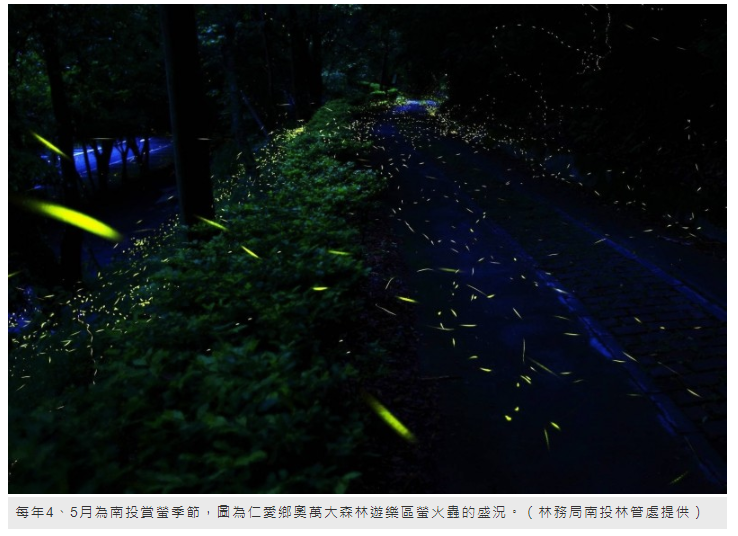 武漢肺炎疫情全球延燒,許多民眾已取消出國旅遊行程,但在國內也可別悶壞了,仍有適合的戶外行程可供國旅參考,時序入春,又到螢火蟲繁殖期,南投縣賞螢熱點埔里鎮桃米休閒農業區,今年賞螢活動將於4月2日即清明節連假首日登場,持續至5月10日,除了桃米休閒農業區,埔里、魚池交界的蓮華池、仁愛鄉奧萬大森林遊樂區、國立中興大學惠蓀林場,泰雅渡假村等地,每年4、5月也是螢火蟲最多的時候,都是南投賞螢的好去處。