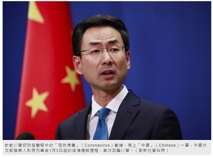 歐美武漢肺炎疫情越趨嚴重,美國總統川普直指武漢肺炎為「中國病毒」,還說用詞無涉種族歧視,更加碼批中國隱瞞疫情,甚至還把防疫簡報中的「冠狀病毒」(Coronavirus)劃掉,寫上「中國」(Chinese)。對此,中國外交部發言人耿爽列舉自1月3日起的疫情通報歷程,氣炸回擊川普。