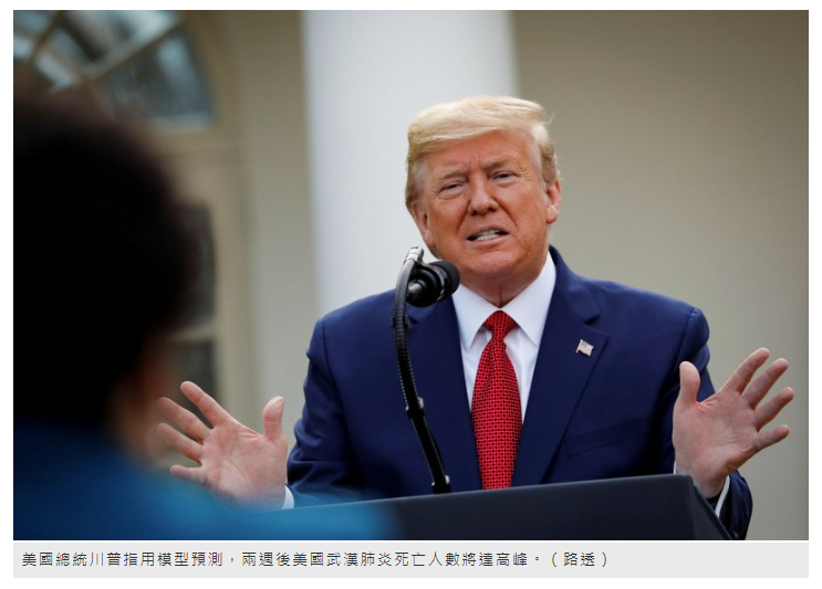 武漢肺炎疫情在美國大爆發,截至目前已逾14萬人確診,高達2千多人死亡,疫情更持續惡化,美國總統川普今天在白宮的記者會上再發警告,指再模型預測死亡人數,未來兩週將達到高峰,而之前已經頒佈的「社交距離防疫建議」(social distancing),將再延長到4月30日。