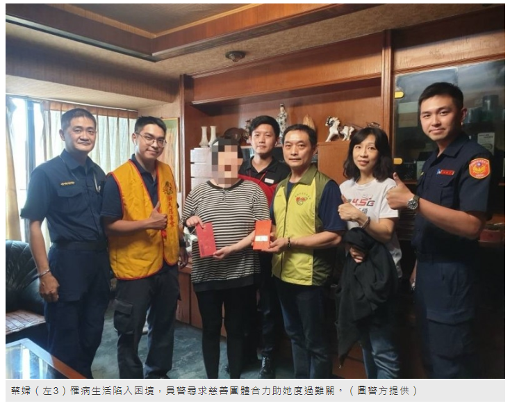 三民第一分局十全所巡佐王㑊珅日前執勤訪查時,得知蔡婦生活困境,便聯繫順天慈善會、晨恩慈善會等團體提供慰問金,幫助蔡婦渡過難關。
