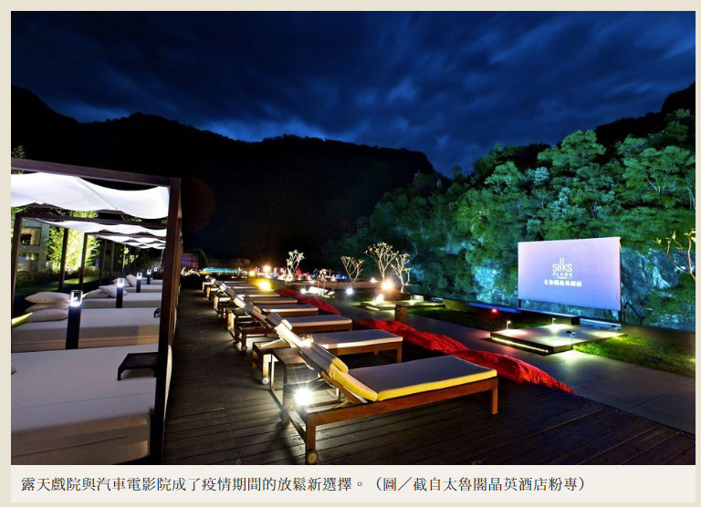 不能出國就到花蓮秘境度假吧!置身峽谷中的「太魯閣晶英酒店」依山傍水,白天可在清幽小徑裡漫步、吸收芬多精,到了夜晚房客可在滿天星空下席地而坐、於山泉池中觀賞大螢幕的露天電影,以及聆聽充滿靈魂的原住民歌唱表演,全台唯一的峽谷星空電影院可以說是超療癒放鬆的觀影體驗。