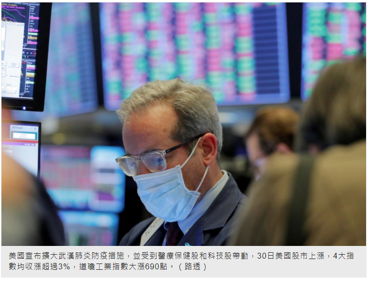 美國宣布擴大武漢肺炎防疫措施,並受到醫療保健股和科技股帶動,30日美國股市上漲,4大指數均收漲超過3%,道瓊工業指數大漲690點。