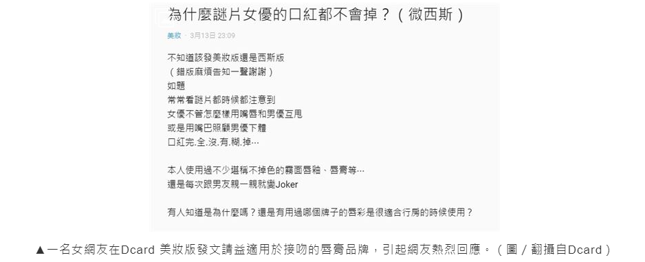 一名女網友在Dcard 美妝版Po文發問「為什麼謎片女優的口紅都不會掉?」原Po表示看A片時常觀察到女優的口紅無論怎麼親、怎麼樣的特殊行為,口紅總是完好如初,當她親自嘗試了多款廣告宣稱不掉色的口紅或霧面唇釉,和男友在魚水之歡後,走進浴室清理卻發現自己唇膏早已暈成一大片變成「Joker」,因此想問網友有沒有推薦可以在行房時候使用而不會崩壞的唇膏品牌,引起網友熱烈回應。