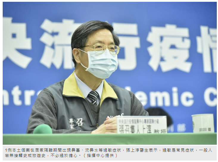中央流行疫情指揮中心今日公布1例本土個案、為先前美國移入確診者的接觸者,在居家隔離期間出現鼻塞、流鼻水等過敏症狀,但指揮中心專家諮詢小組召集人張上淳表示,過敏是常見症狀,一般人若無接觸史或旅遊史,不必過於擔心。