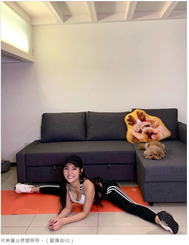 何美11日在IG透露:「拍了居家運動影片,期待一下。」只見照片中,她穿著短版運動內衣,搭配緊身運動褲,並將雙腳張開呈現劈腿姿勢。不過最吸睛的,莫過於何美將整個上半身往前傾,豐滿豪乳及性感深溝一覽無遺,更隱約看見她蜜桃翹臀。