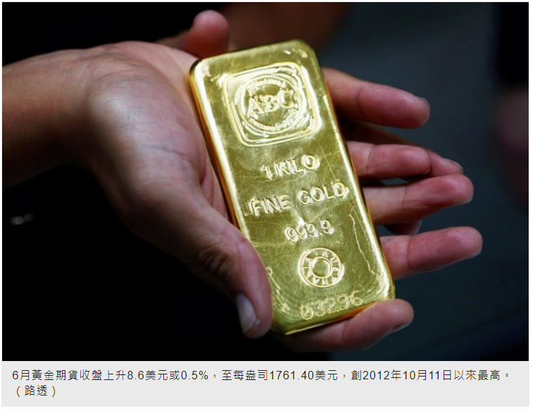 隨著美股走跌,市場預期各國政府及央行會進一步採取行動應對,在資金流入避險資產下,週一(13日)國際金價持續收高,6月黃金期貨收盤上升8.6美元或0.5%,至每盎司1761.40美元,創2012年10月11日以來最高。