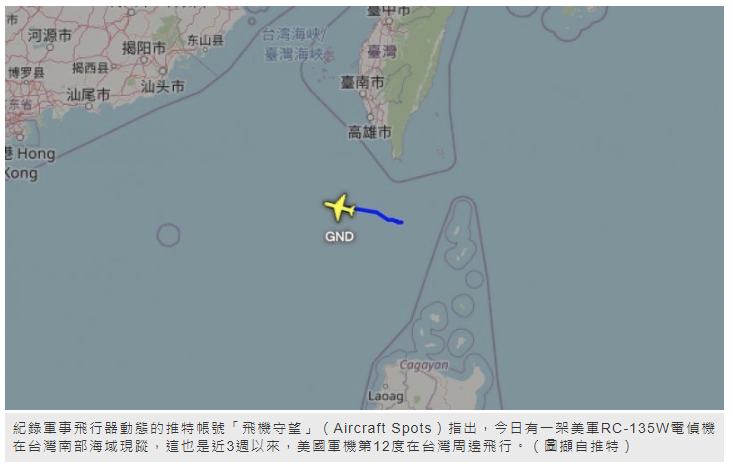 不過美方今日也再度派出軍機在台灣周邊飛行,據「飛機守望」(Aircraft Spots)指出,今日在台灣南部海域現蹤的是RC-135W電偵機,這也是美國軍機在過去3週內第12度出現在台灣周邊空域。