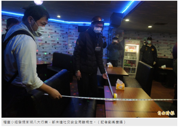 一名酒店公關染疫,導致全國酒店、舞廳停止營業,澎湖縣並嚴格規定進入八大行業實名制登記、遵守社交距離室內1.5公尺安全距離;昨日深夜10時由建設局長許智富領軍,聯合衛生局長蕭靜蓉、警察局長楊鴻正及各相關單位,浩浩蕩蕩前往轄區展開清查。
