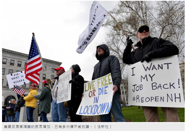綜合媒體報導,光在美國時間4月18日當天,就有新罕布夏州、馬里蘭州、德州、俄亥俄州、印第安納州、內華達州、威斯康辛州等,出現民眾反對居家隔離令的示威活動。