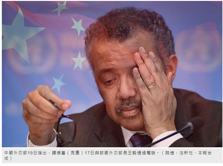 中國外交部19日發布訊息,中國外交部長王毅曾於17日與譚德塞通話,王毅當時指稱,這通電話是要表達中國政府與民眾對世衛的支持之意,國際社會與全球人民均秉持「公道自在人心」的態度,支持世衛、支持譚德塞,就是維護多邊主義、維護聯合國,王毅肯定譚德塞對全球公衛的付出,並稱此已獲得各方高度評價。
