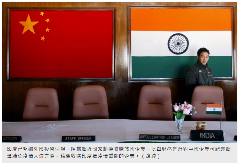 全球反中浪潮一波接著一波!印度已緊縮外國投資法規,阻擋鄰近國家趁機收購該國企業,此舉顯然是針對中國企業可能趁武漢肺炎疫情大流之際,藉機收購印度遭疫情重創的企業。