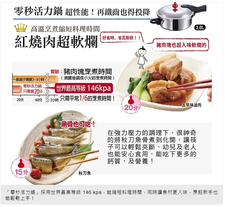 「零秒活力鍋」採用世界最高等級 146 kpa ( 一般壓力鍋的 1.6 倍壓力 ),能省下 1 - 2 小時的等待時間,只需要 20 分就能燉出一鍋入味又可口的滷肉!除此之外,強力的壓力就算是充滿鈣質的魚骨也能輕鬆煮到化開,將食材中的營養精華一分不差的完整保留,更不需加任何一滴水,百分之百原汁,更提供免費豐富百樣食譜教學,新手也能輕易上手,真是現代講求效率上班族的廚房必備神器!省時又省事,節電超便利!