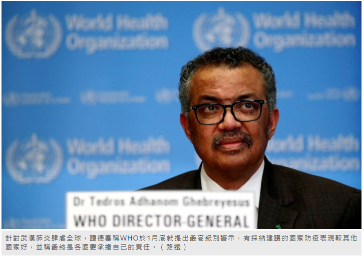 武漢肺炎疫情延燒全球,世界衛生組織(WHO)因處理武漢肺炎疫情不當,飽受國際批評,秘書長譚德塞(Tedros Adhanom Ghebreyesus)更因爭議言論遭外界批評,不過譚德塞始終堅稱WHO沒錯,27日再度稱WHO於1月底就提出最高級別警示,有採納建議的國家防疫表現也較其他國家好,並稱最終是各國要承擔自己的責任。