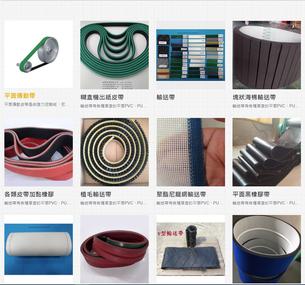 竑剛企業有限公司他們家除了是台灣知名的皮帶生產企業之外,他們的產品也有外銷到日本以及歐美國家等地,就因為MIT品質的保證,連這些先進國家的工業也愛用他們家的產品,產品擴及到包含平面傳動皮帶、各式輸送帶、三角皮帶、齒型時規皮帶、PU圓形帶(萬可帶)、刺皮(止滑帶)、聚酯尼龍網輸送帶、帆布平面帶、牛皮傳動帶、耐高溫鐵氟龍膠帶、耐高溫鐵氟龍玻纖布、耐高溫鐵氟龍網帶、耐高溫矽膠輸送帶、黑橡膠輸送帶、人字型橡膠輸送帶、時規齒輪製做及各式皮帶加工處理。