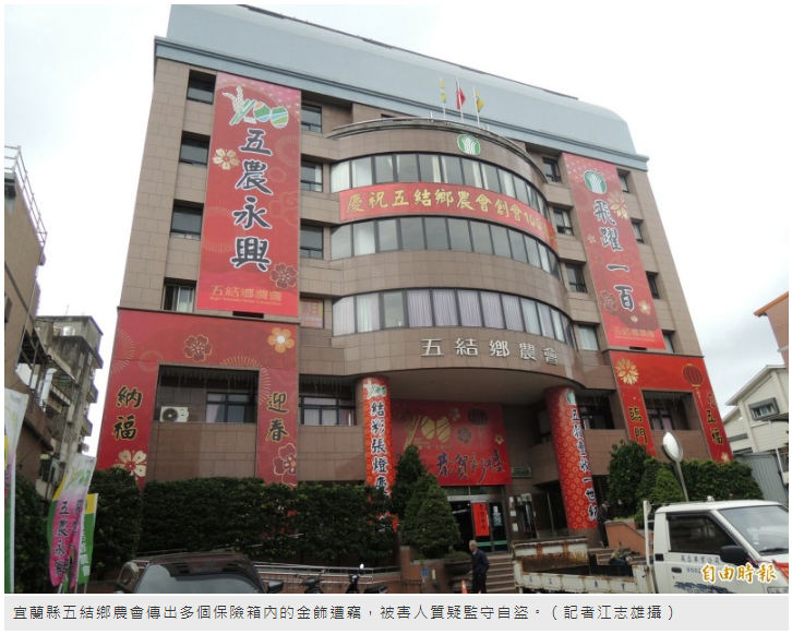 五結鄉農會保險箱內的保管物品,包括金飾、金條等貴重物,一週前陸續傳出遭竊,單筆最高損失金額上百萬元,由於保險箱要經過多道關卡才能打開,被害人認為,外賊侵入行竊機率不高,懷疑「內鬼」所為。
