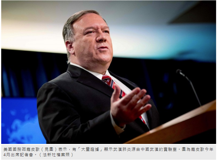 美國國務卿龐皮歐今天表示,有「大量證據」顯示,目前肆虐全球的冠狀病毒大流行疫情源起中國武漢的實驗室。