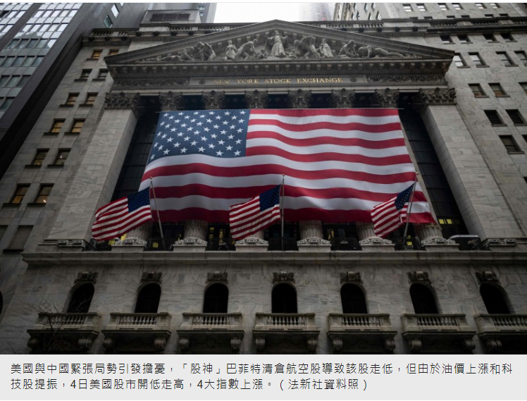 美國與中國緊張局勢引發擔憂,「股神」巴菲特清倉航空股導致該股走低,但受到油價上漲和科技股領漲提振,4日美國股市開低走高,4大指數上漲,結束2日連跌的走勢。