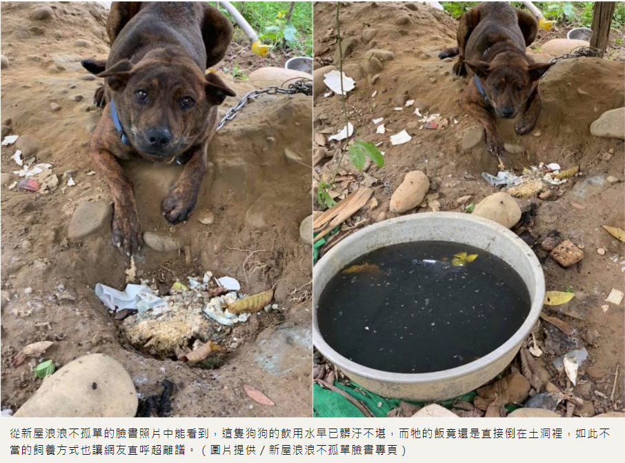 新屋浪浪不孤單臉書專頁是由收容所的志工許小姐所經營,她不僅經常分享幫收容所拍攝的毛孩照片,也會告訴網友正確的動保觀念,而近日的一則臉書PO文卻讓許多網友都怒了!貼文中提到,她當天參加相信動物協會的家犬絕育計畫時,發現有隻狗狗被綁在菜田中間,牠的鐵鍊轉了好幾圈、變得很短,而牠面前大盆子裡的飲用水,混濁到比水溝水還要髒,加上狗狗的狗碗竟是直接以牠面前的土洞所代替,剩菜剩飯就直接倒在裡頭要給牠吃,甚至狗狗的屋頂僅是一片廁所拆下來的門、沒有遮風避雨的地方,周邊還充滿了蚊子蒼蠅。更讓人心痛的是,即便狗狗受到如此不當的對待,照片中牠的眼神還是單純無比,似乎不恨主人對牠做的一切。