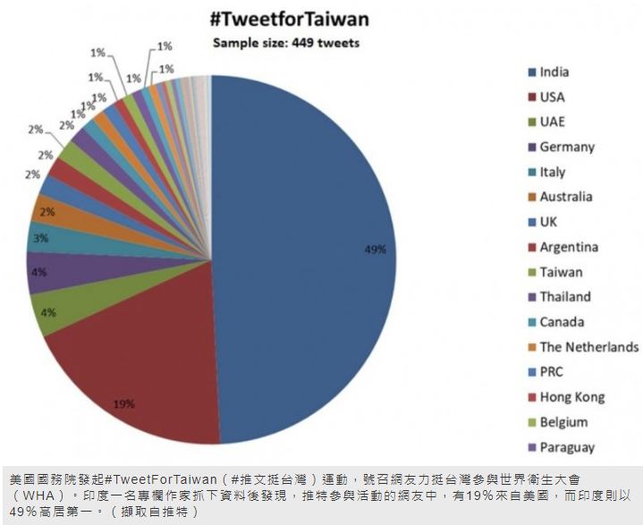 武漢肺炎(新型冠狀病毒疾病,COVID-19)疫情中,台灣以出色的防疫措施在國際上博得掌聲,也越來越多國家挺身而出為台發聲。美國國務院就發起了#TweetForTaiwan(#推文挺台灣)運動,號召網友推文挺台灣參與世界衛生大會(WHA)。對此,印度一名專欄作家抓下資料後發現,推特參與活動的網友中,有19%來自美國,而印度則以49%高居第一,這樣的結果,也讓台灣網友既感激又意外。