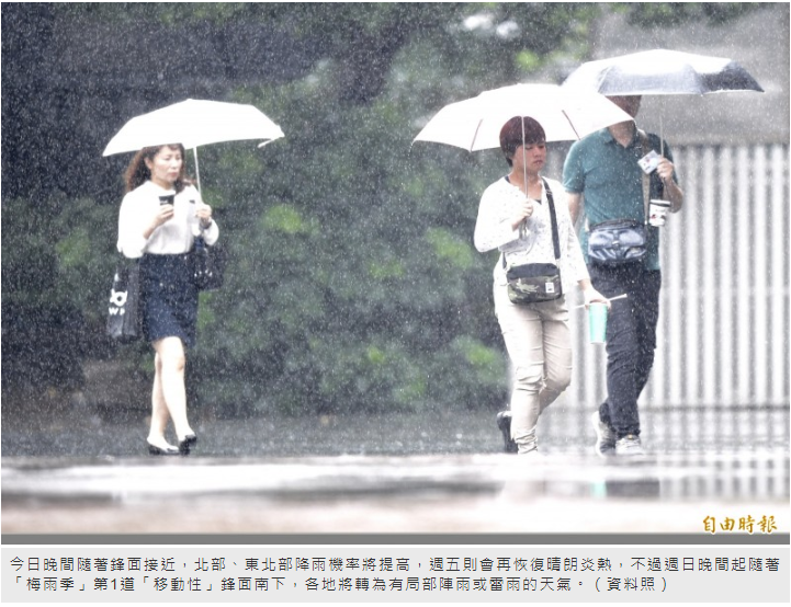 近日氣溫連連飆高,各地持續高溫炎熱,今日南高屏投等4縣市持續出現高溫警示,不過晚間隨著鋒面接近,北部、東北部降雨機率將提高,週五則會再恢復晴朗炎熱,不過週日晚間起隨著「梅雨季」第1道「移動性」鋒面南下,各地將轉為有局部陣雨或雷雨的天氣,且有「劇烈」天氣發生的機率。